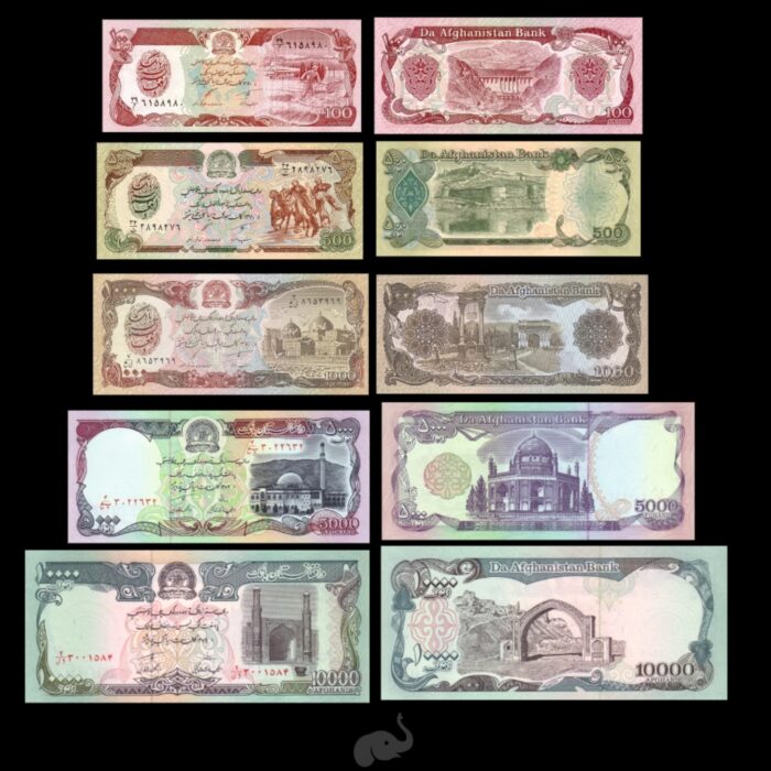 Afghanistan 100 – 10,000 Afghanis 1979-99 UNC set of 5