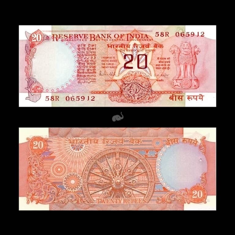 India 20 Rupees 1970-2002 P-82g R N Malhotra A Inset UNC Bank Note