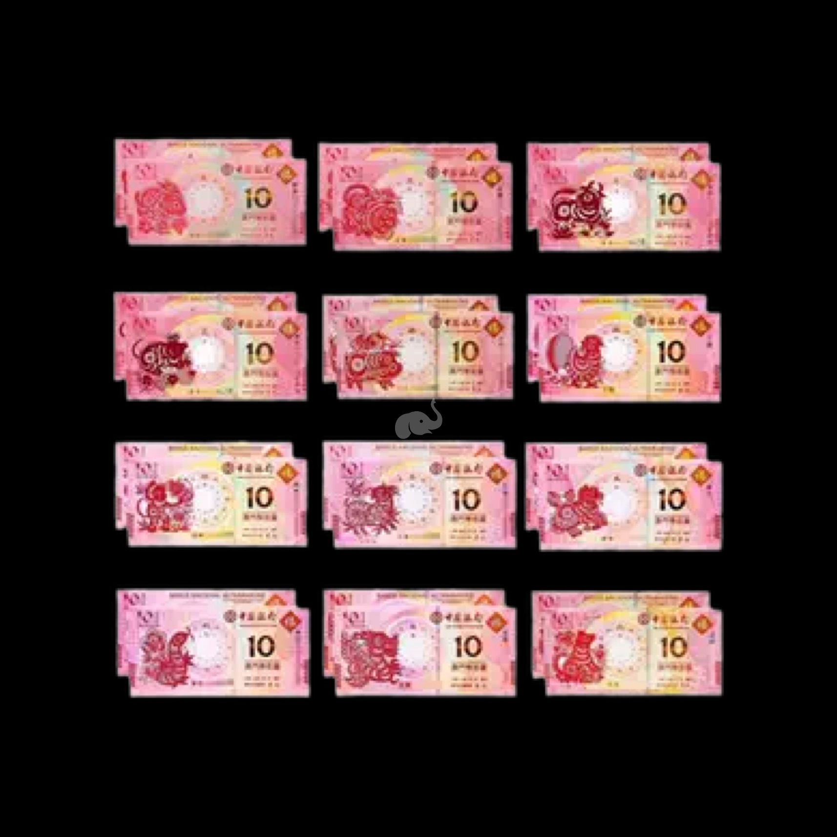 Macau 10 Patacas Zodiac set 12 different Zodiacs issued by 2 different banks Total 24 notes UNC
