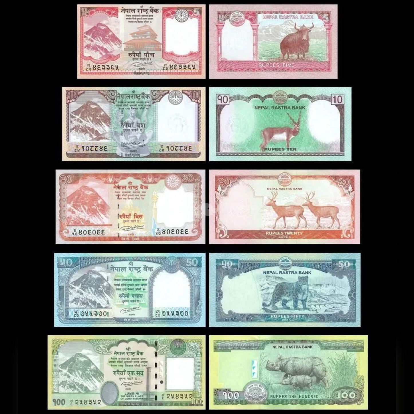 Nepal Set of 5 notes 5,10,20,50,100 Rupees UNC