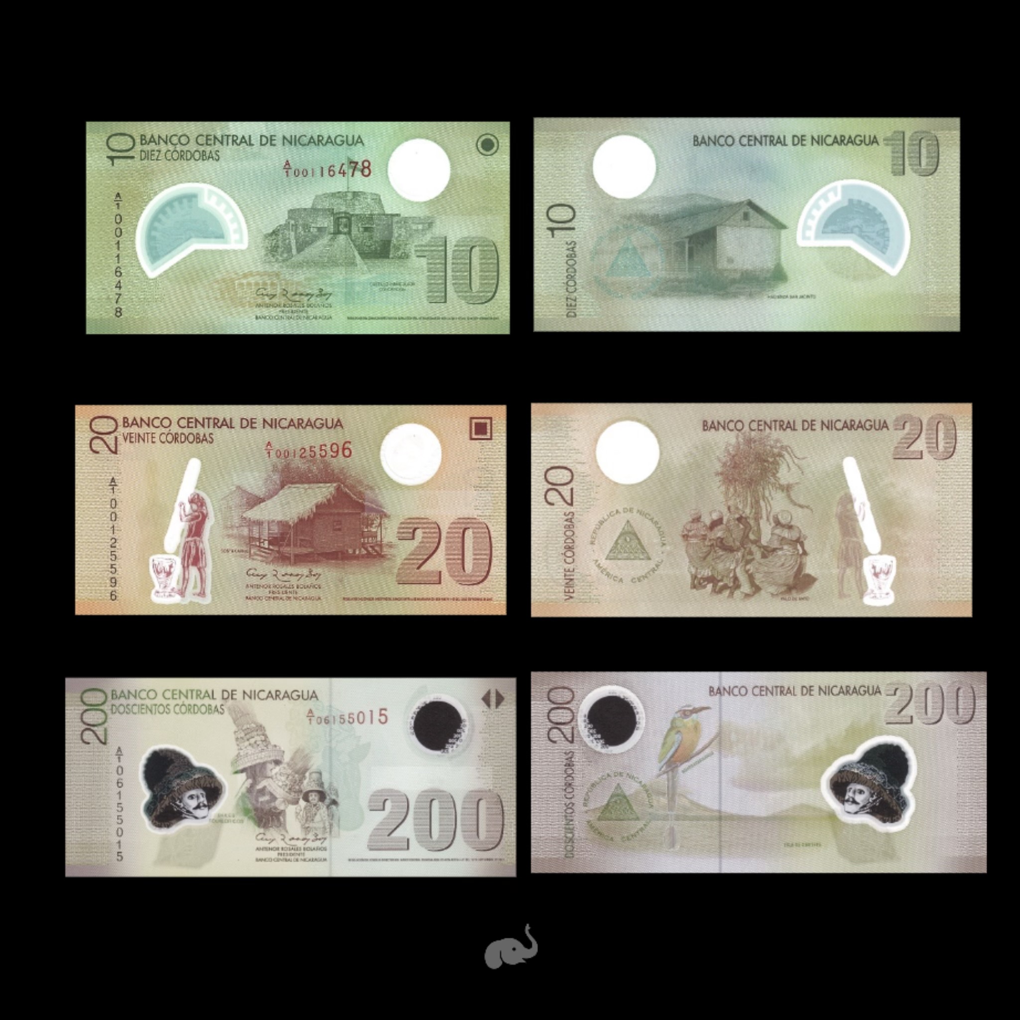 Nicaragua 10, 20 & 200 Cordobas 2017 P-203A-205A UNC Polymer Bank Note
