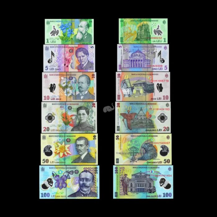 Romania 1 Lei to 100 lei 2005-24 set of 6 UNC Polymer Bank Notes
