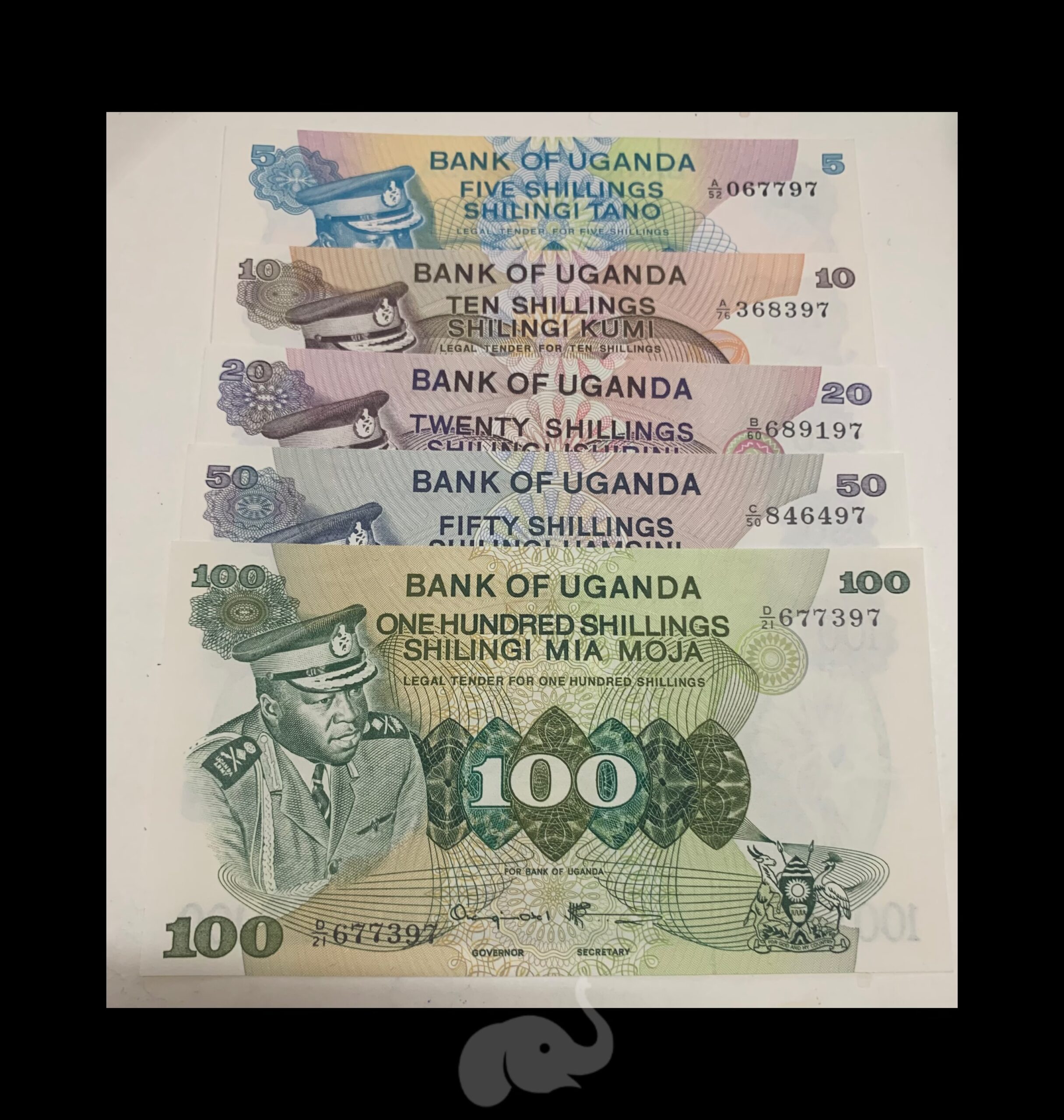 Uganda 5 – 100 Shillings 1973-77 Idi Amin UNC set of 5