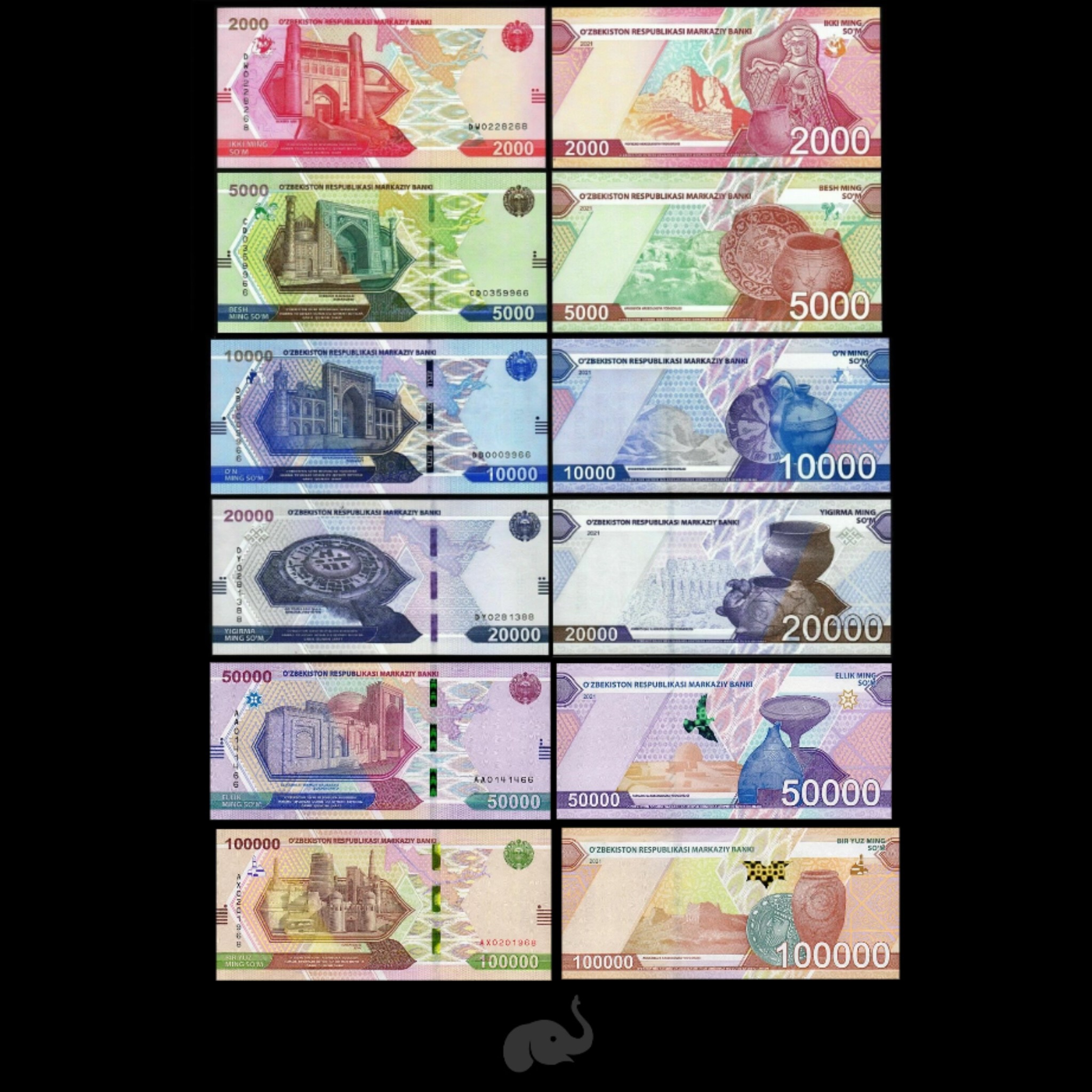 Uzbekistan 2k-100k som 2021-22 UNC set of 6 bank notes