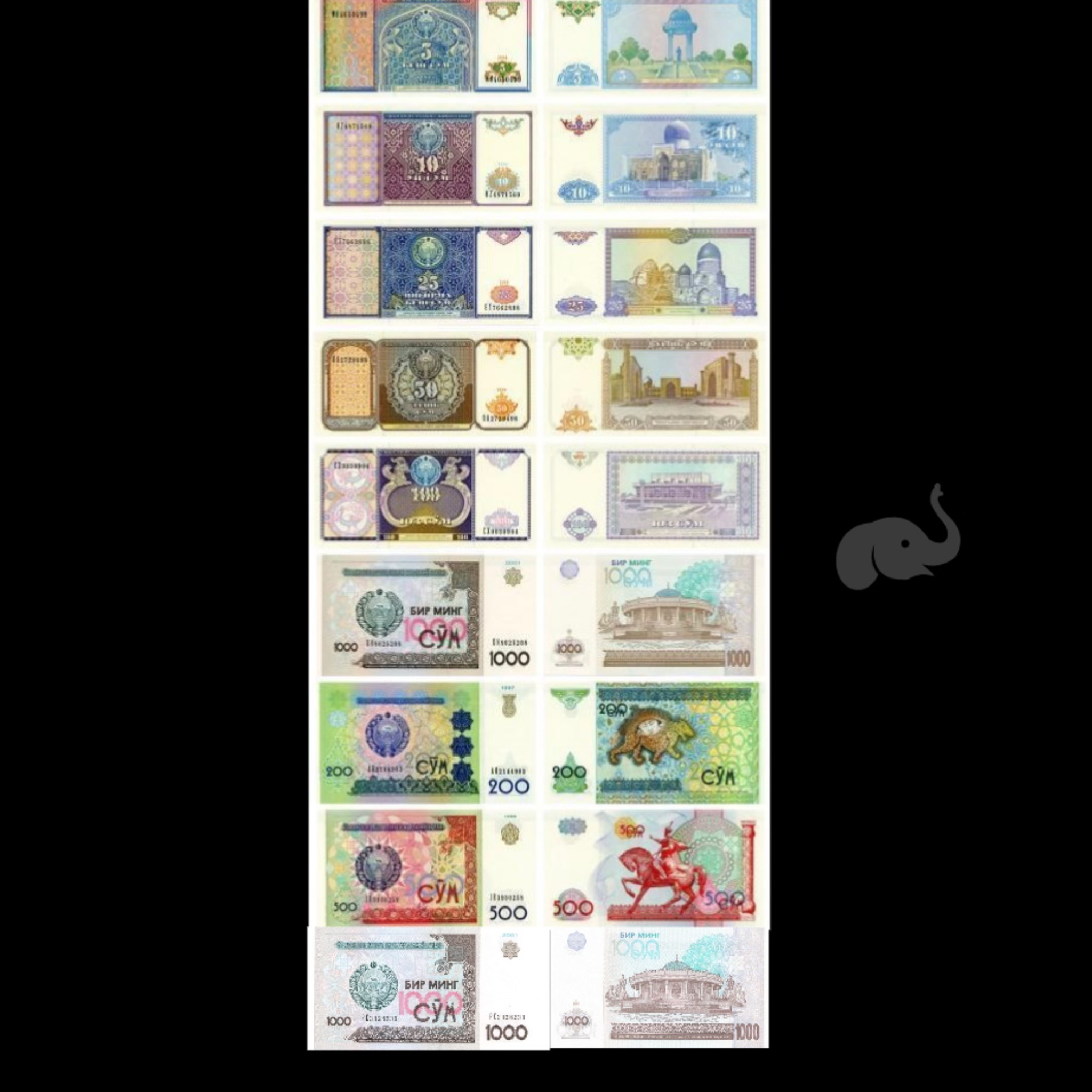 Uzbekistan 5 – 1000 som 1994 set of 8 UNC Notes